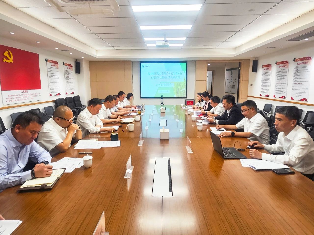 6月13日,農(nóng)業(yè)銀行云南省分行到訪云南農(nóng)擔公司開展業(yè)務(wù)推進座談,進一步落實雙方年初銀擔合作座談會議精神,總結(jié)上半年工作進展情況,謀劃推動下半年各項工作。農(nóng)業(yè)銀行云南省分行黨委委員盧偉,省公司總經(jīng)理李世偉,副總經(jīng)理廖寅皓、梁威出席會議。農(nóng)業(yè)銀行云南省分行鄉(xiāng)村振興金融部、普惠金融事業(yè)部、農(nóng)戶金融部及省農(nóng)擔公司業(yè)務(wù)發(fā)展部、風(fēng)險控制部、資產(chǎn)保全與法律事務(wù)部、戰(zhàn)略發(fā)展部負責(zé)人參加會議。